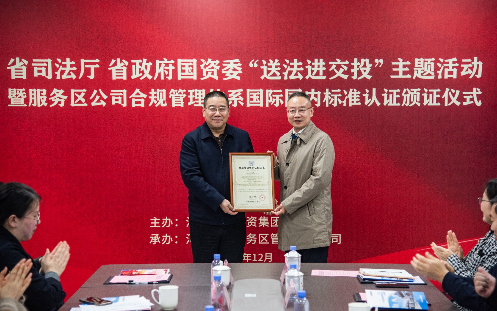 12月4日是第十二個國家憲法日,省司法廳、省政府國資委在集團所屬連霍高速開封服務區聯合開展“送法進交投”憲法宣傳周主題活動暨服務區公司合規管理體系國際國內標準認證頒證儀式。省司法廳二級巡視員武寶山,普法與依法治理處處長楊永峰;省政府國資委黨委委員、副主任劉孟連,研究室處長李會展、副處長李衛敏;中國檢驗認證集團華中區域黨委副書記、常務副總經理胡小鐘,河南公司黨委委員、副總經理任源;交投集團黨委委員、副總經理馬沉重,法律事務部經理劉巍;服務區公司黨委書記、董事長谷源,總經理、黨委副書記、副董事長邱建成,黨委委員、副總經理張帥、閻瑞杰等出席會議。